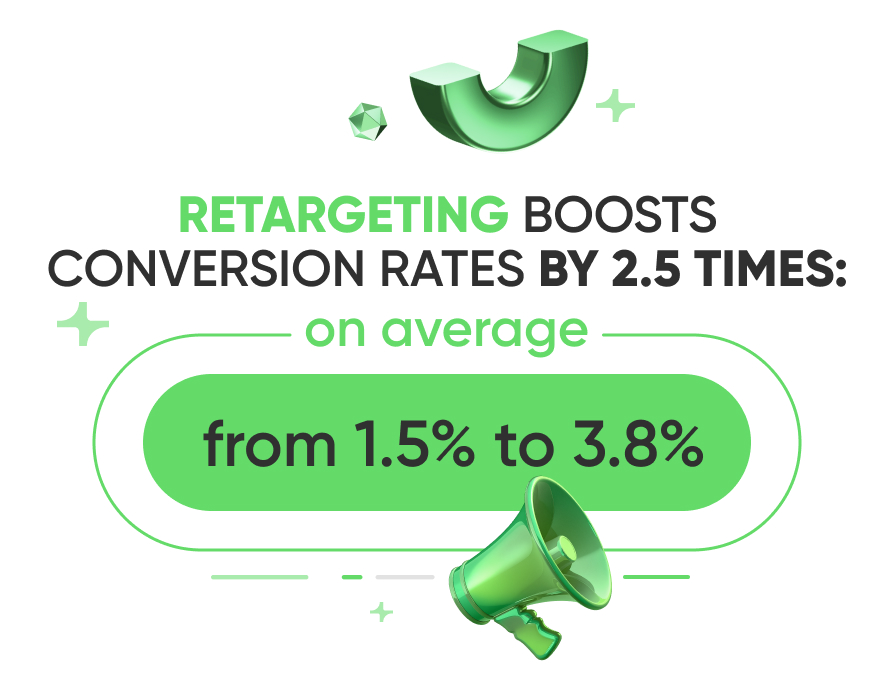 - Retargeting boosts conversion rates by 2.5 times: on average from 1.5% to 3.8%.