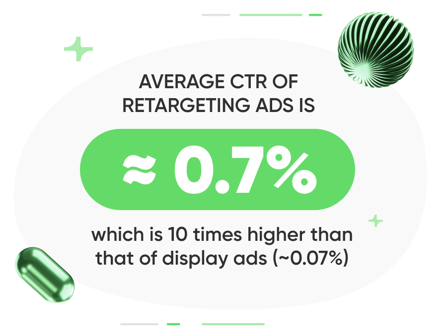 - Average CTR of retargeting ads is ≈ 0.7%, which is 10 times higher than that of display ads (~0.07%)