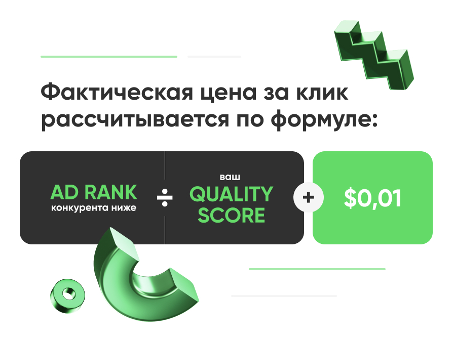 Формула расчета CPC: (Ad Rank конкурента ниже ÷ ваш Quality Score) + $0,01