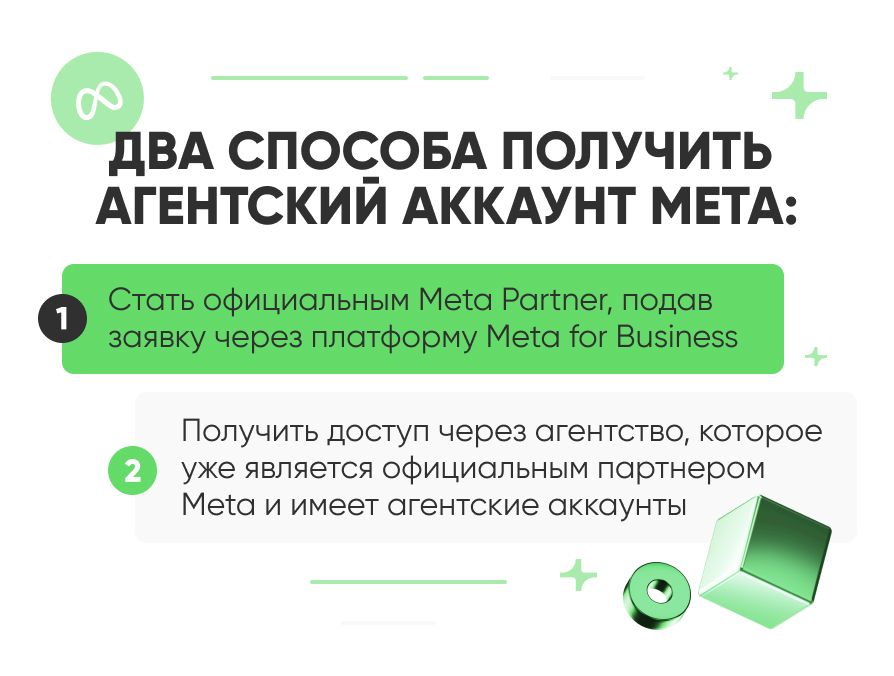 Как мы уже упоминали, получить агентский аккаунт Meta можно двумя путями — официальным, через партнерскую программу Meta, или через агентство, уже имеющее статус партнера и предоставляющее доступ к своим аккаунтам клиентам.