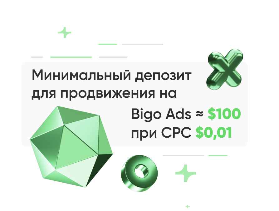- Аккаунты Bigo — недорогая площадка для тестов (минимальный депозит ≈$100, при CPC$0,01 это 10000+ кликов на первый сплит-тест)