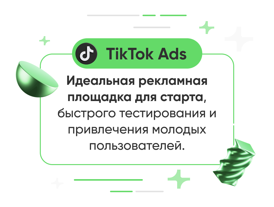 TikTok Ads — идеальная платформа для старта, быстрого тестирования и привлечения молодых пользователей.