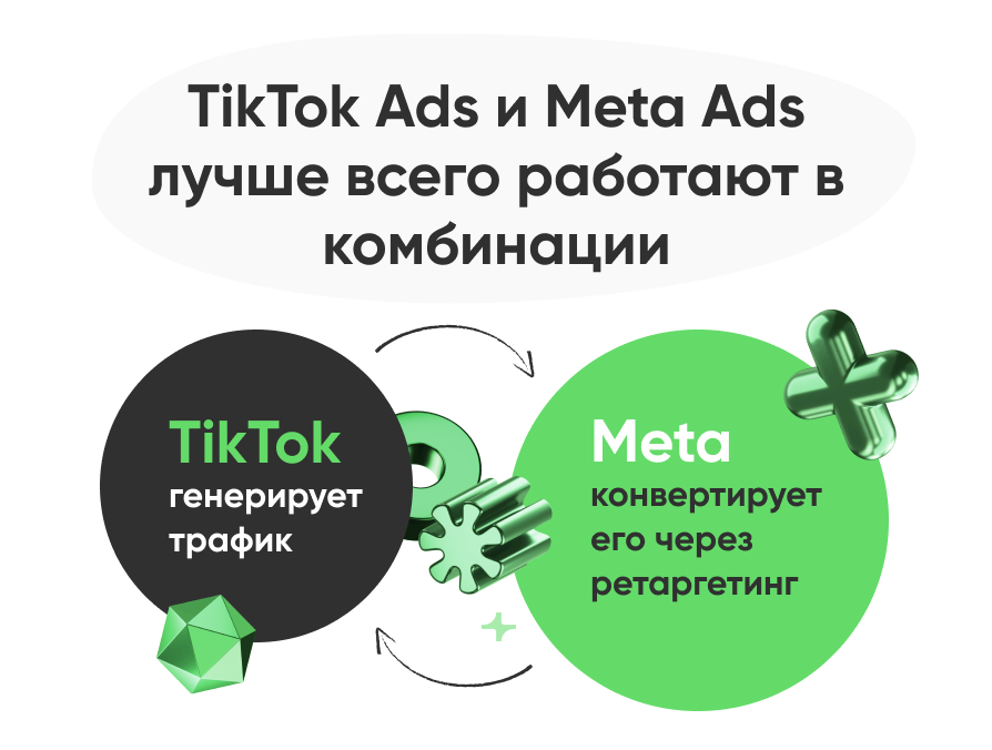 Лучшие результаты для бизнеса дает комбинация этих двух методов продвижения. Например, когда через TikTok Ads генерируется трафик, затем Meta конвертирует его через ретаргетинг.