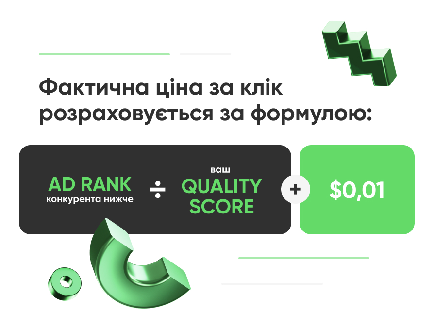 Формула розрахунку CPC: (Ad Rank конкурента нижче ÷ ваш Quality Score) + $0,01