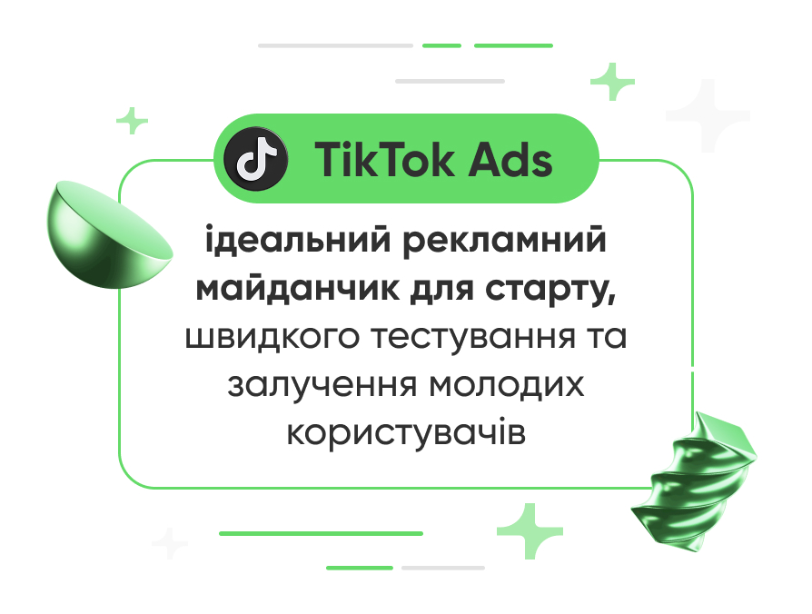 TikTok Ads — ідеальна платформа для старту, швидкого тестування та залучення молодих користувачів.