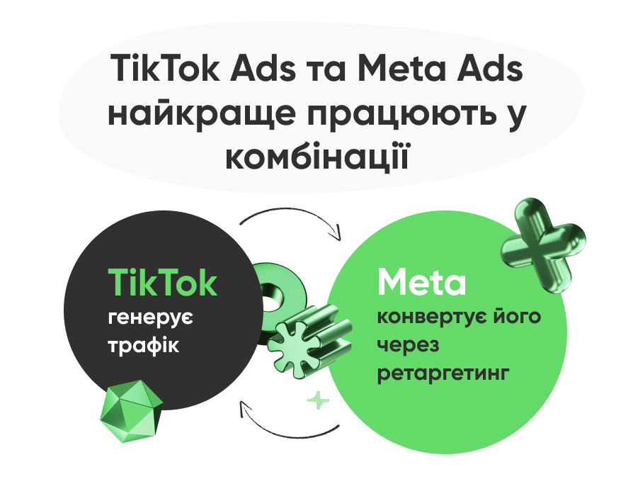 Найкращі результати для бізнесів дає комбінація цих двох методів просування. Наприклад, коли через TikTok Ads генерується трафік, а потім Meta конвертує його через ретаргетинг.